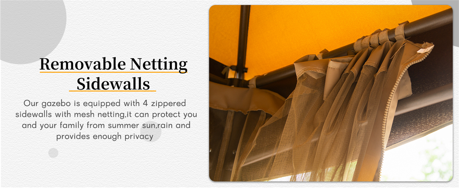 - REMOVABLE NETTING: This gazebo comes with 4 zippered mesh netting sidewalls.They can be zipped together to surround the whole gazebo to block the summer sun and keep good ventilation.They can also be removed when you don't need them.