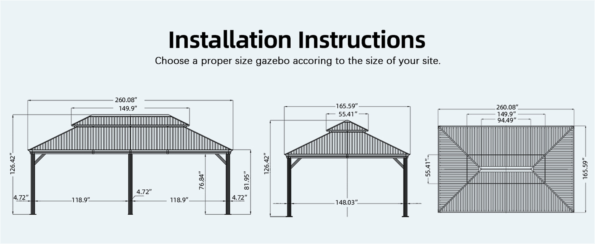 - Fade and Rust Resistance- The galvanized steel metal top is fade-resistant and rust-resistant, prolonging the life of this aluminum gazebo.