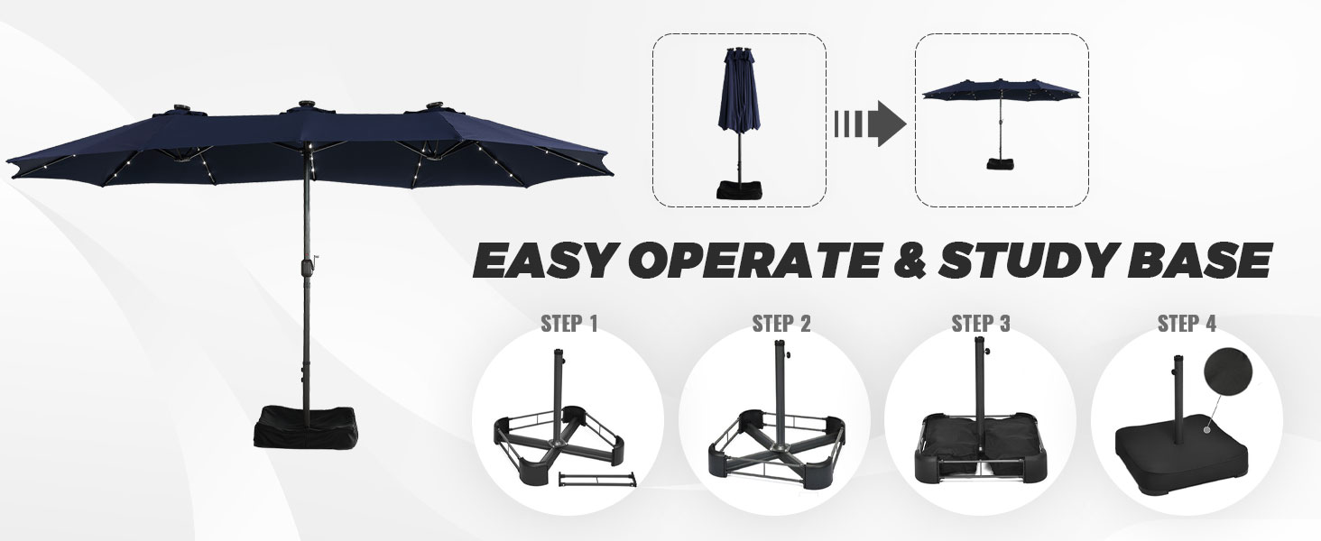Umbrella Base Included: The umbrella comes with a durable umbrella base that is made of a metal frame, two sandbags, and a bag cover. Each sandbag can be filled with 130 lbs of sand, making the umbrella extremely stable and secure.