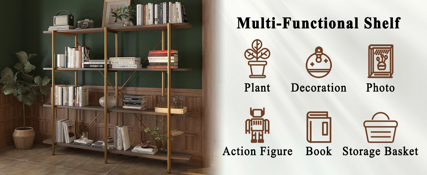 - Durable and sturdy: the metal bookshelf is made of brushed stainless-steel frame and sturdy MDF wood veneer for high durability and stability the gold-colored metal side rods and x-bars in the back improve stability and add a focal point to your room