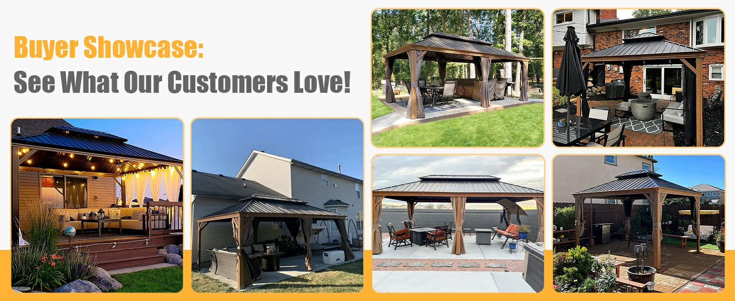 6. NETTING AND CURTAINS: Our permanent hardtop gazebo sports a dual-slide design that features zippered, double-layered sidewalls. These sidewalls provide added protection, including sunlight, UV, rain, snow, and mosquitoes - and they enhance privacy too. Enjoy a safe, comfortable environment in your outdoor hardtop gazebo.