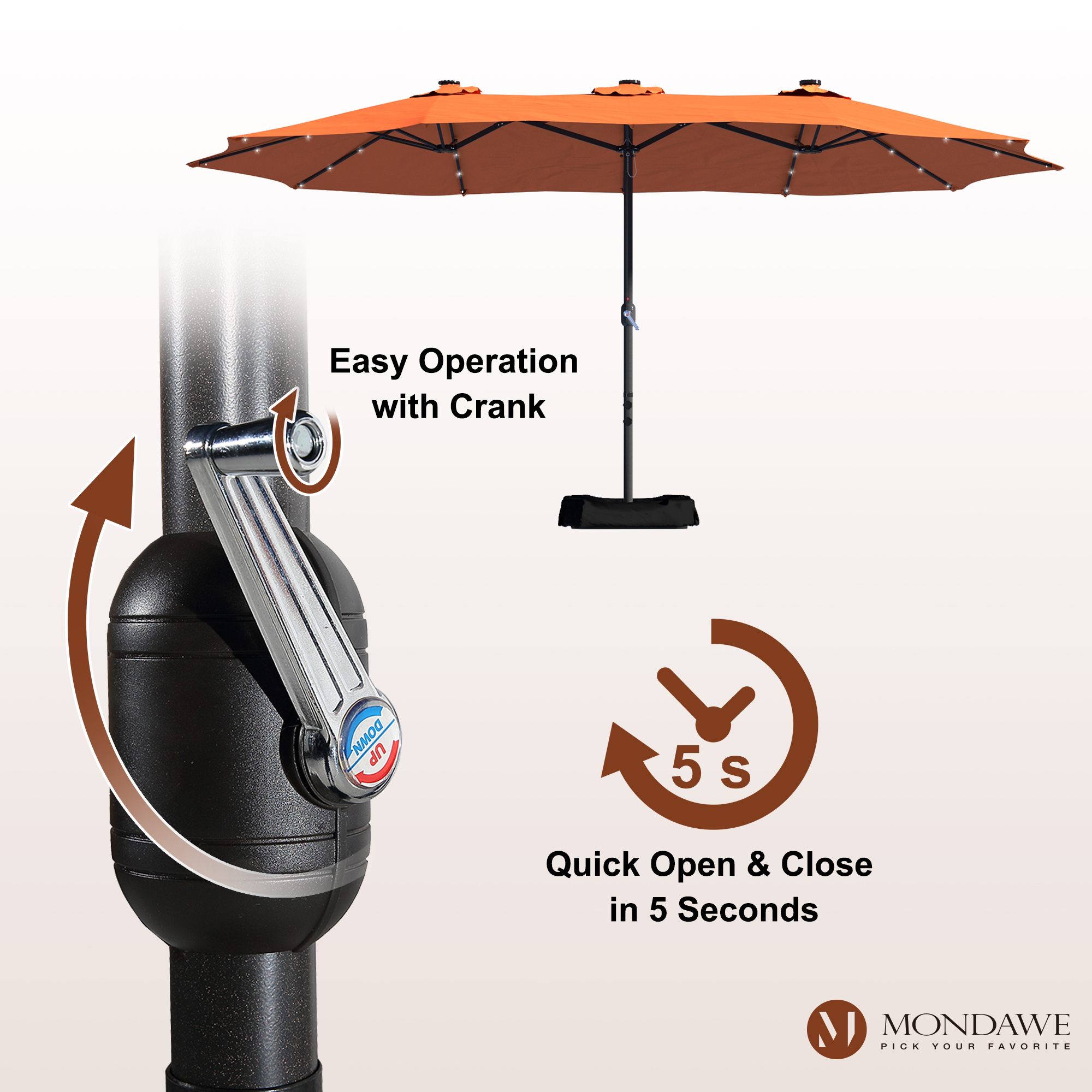 Easy Operated Crank Lift System: The umbrella's hand-crank lift system makes it easy to set up and take down. You can relax within seconds, and the rope tie on the canopy helps fasten the umbrella.