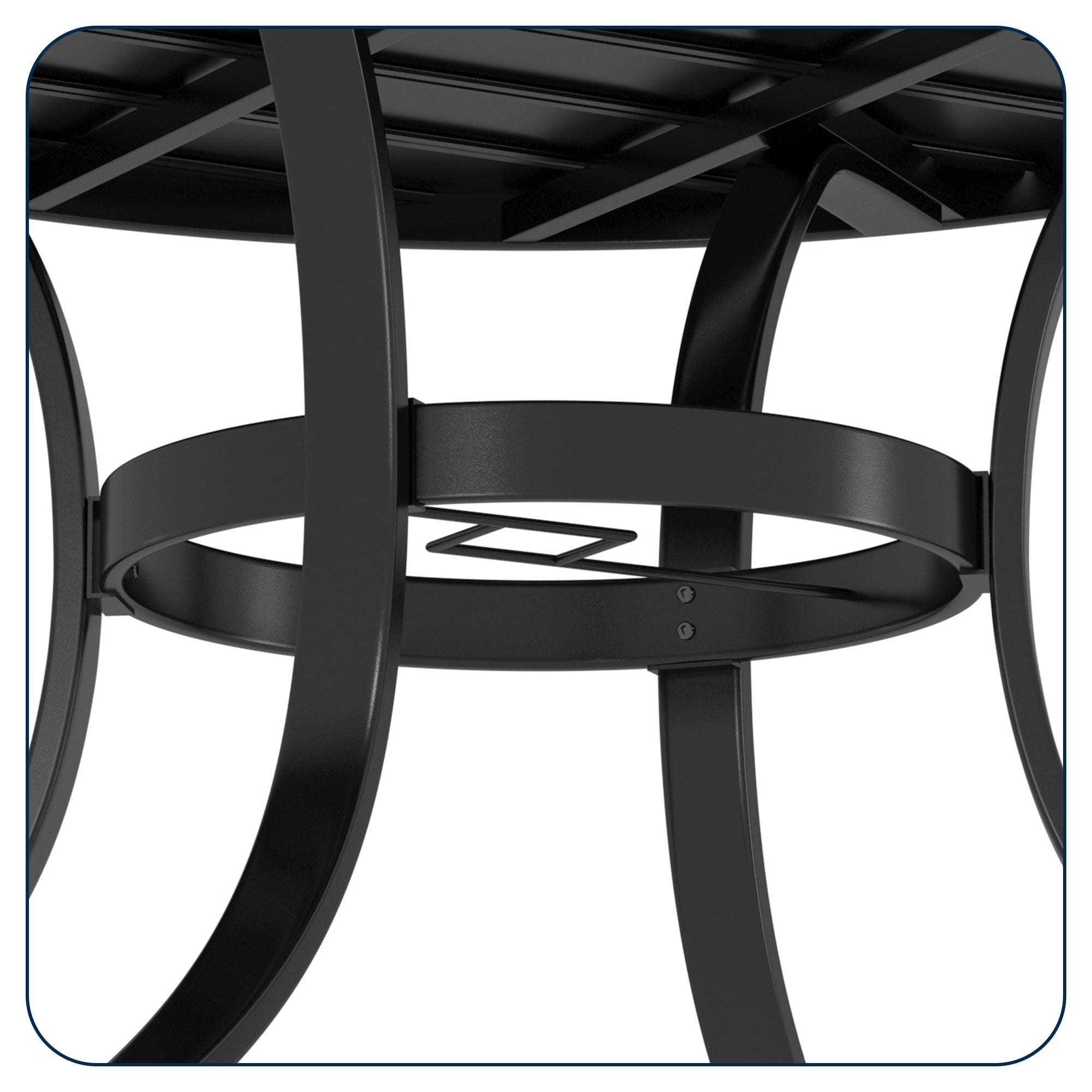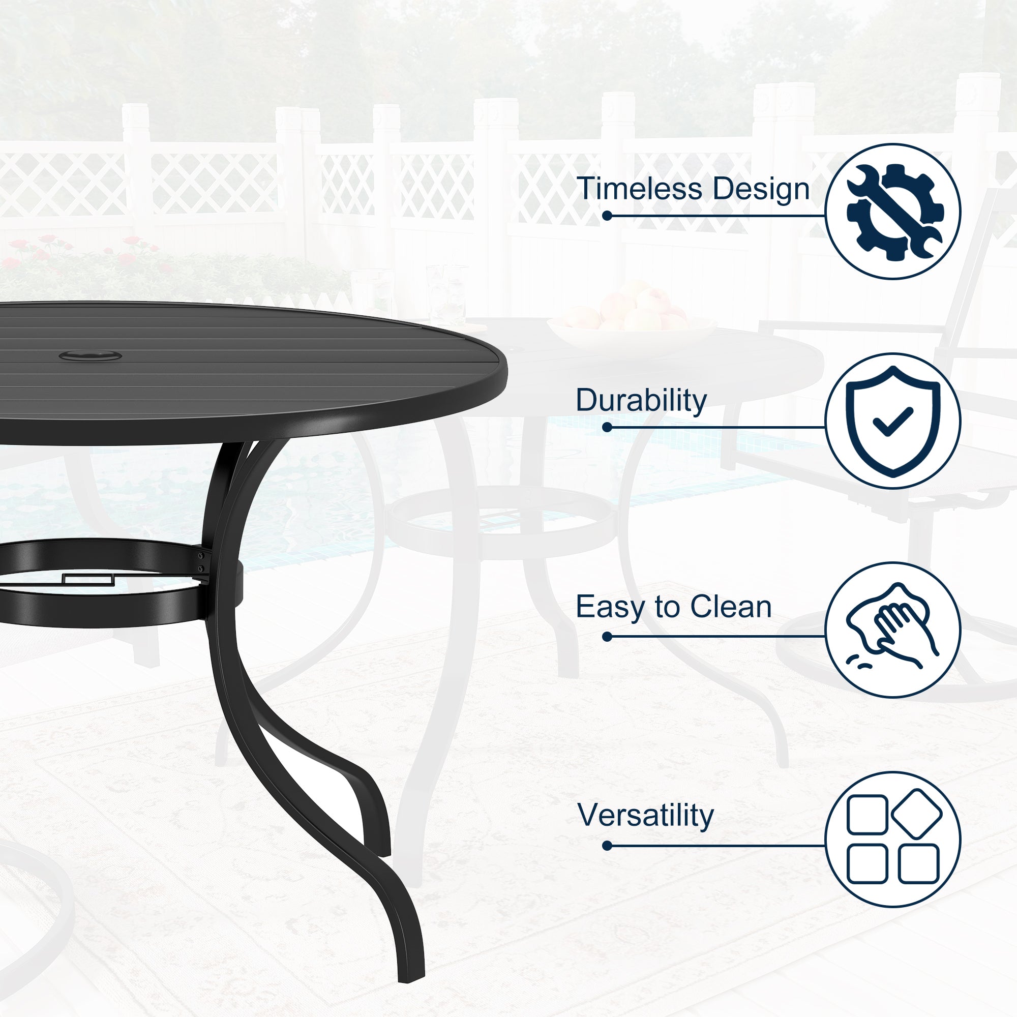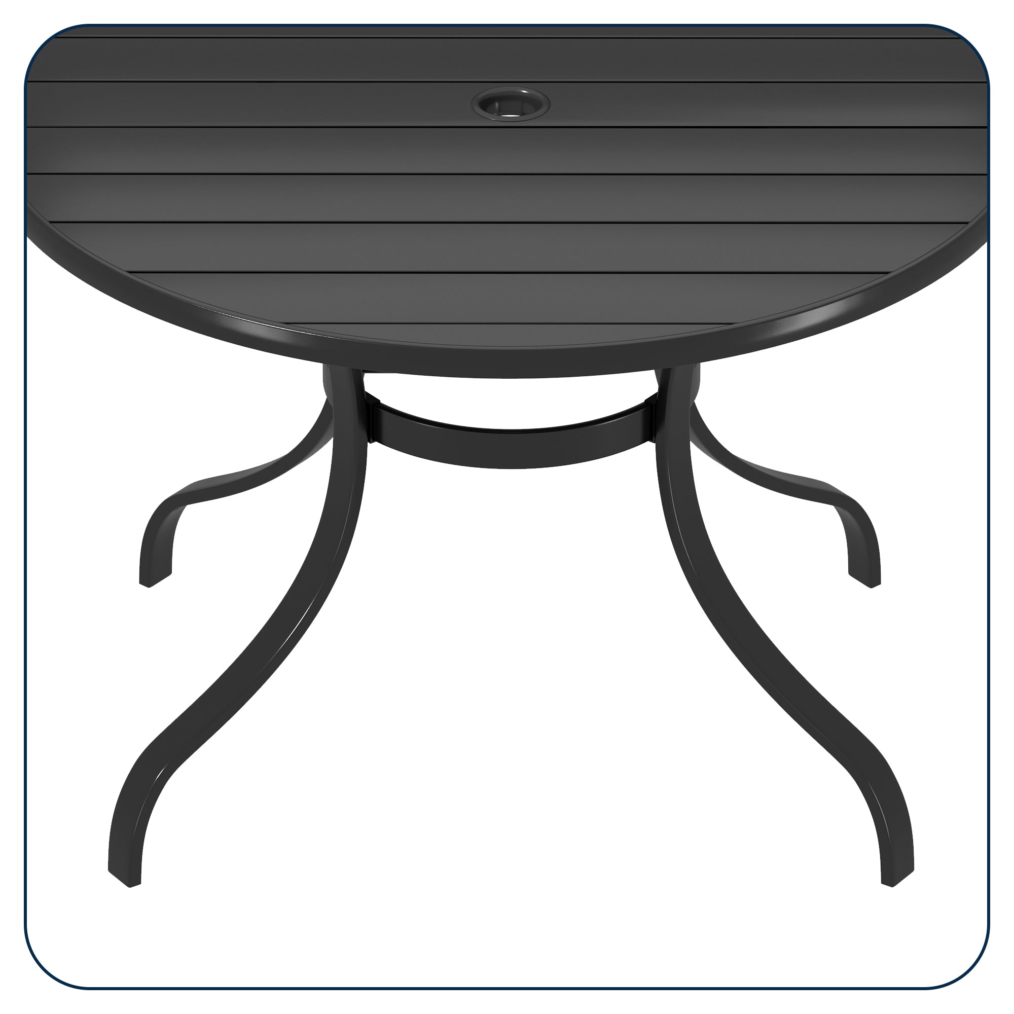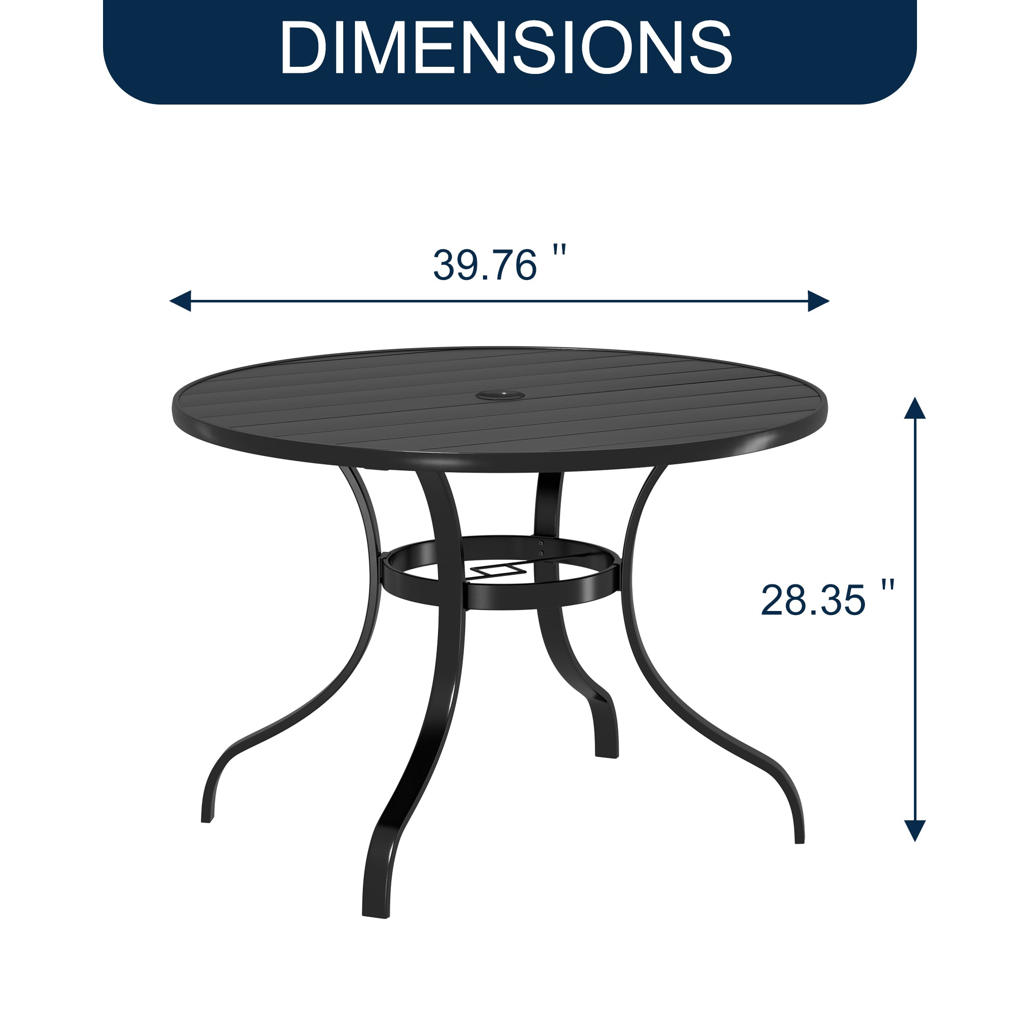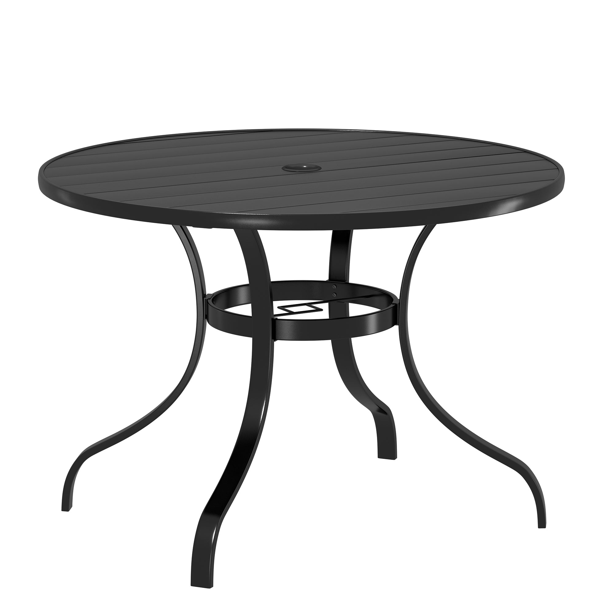 This round dining table is suited for 4-people and with 1.65 in. diameter umbrella hole that fits patio umbrellas which can protect you from the bright sun. The elegant design is suitable for both outdoor gardens and indoor leisure time, this round table can even be paired with our swivel or dining chair. This patio round table features a stylish modern iron slat tabletop that can be easily cleaned up and serve you for a long time. The tabletop is flat and the gap between the tabletops is very small so your items won't fall out easily. Frame with E-coating powder coating rust resistance and weather-resistant and even corrosion, easy to assemble.