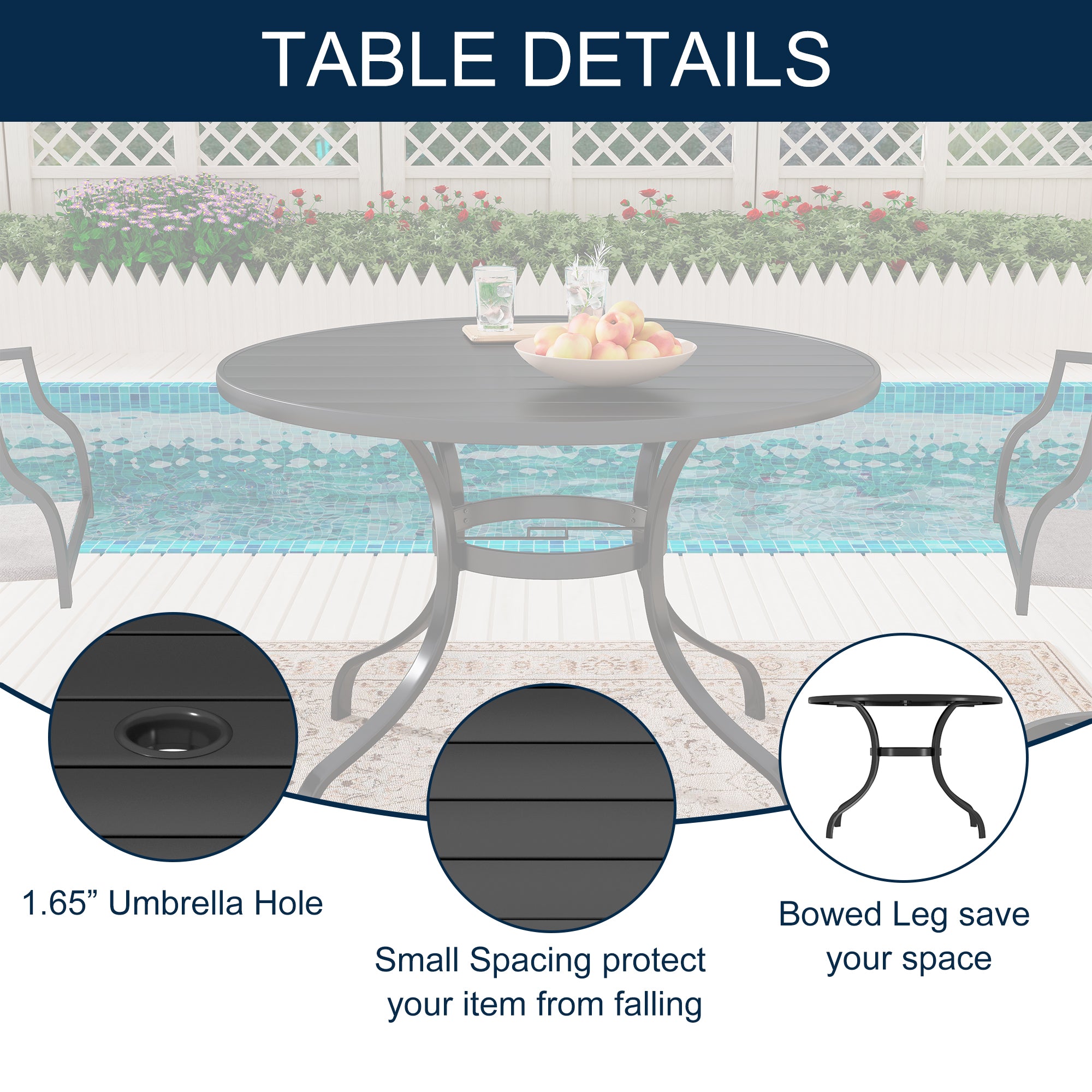 - Tabletop is equipped with an umbrella hole, allowing for easy installation of a patio umbrella hole can accommodate umbrella poles with a diameter of up to 165 in. making it compatible with a wide range of umbrellas